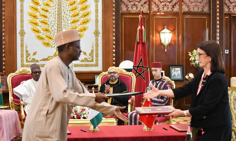 جلالة الملك والرئيس النيجيري يترأسان حفل التوقيع على ثلاث اتفاقيات للتعاون الثنائي، واحدة منها مرتبطة بالمشروع الاستراتيجي لأنبوب الغاز الرابط بين نيجيريا والمغرب