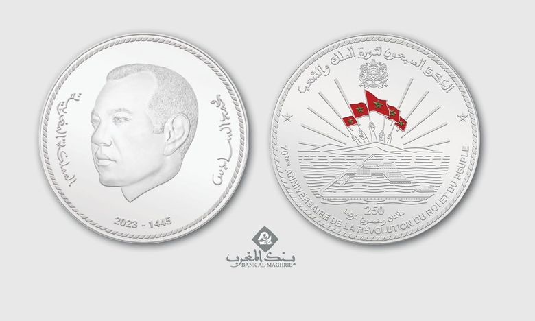 أصدر بنك المغرب قطعة نقدية تذكارية فضية من فئة 250 درهما تخليدا للذكرى السبعين لثورة الملك والشعب .