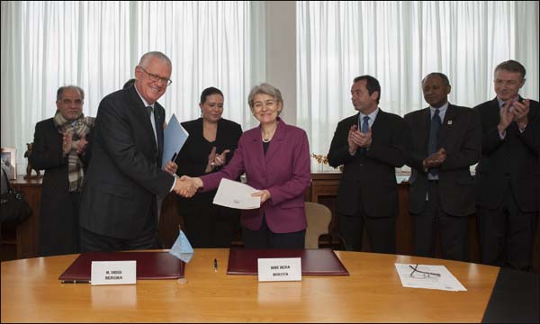 وقعت المديرة العامة لمنظمة الأمم المتحدة للثقافة والعلوم والتربية "يونسكو" إيرينا بوكوفا، والرئيس المدير العام للخطوط الملكية المغربية (لارام)، إدريس بنهيمة، بحضور السفيرة المندوبة الدائمة للمغرب لدى اليونسكو، زﻫﻮر اﻟﻌﻠﻮي، اتفاقية شراكة لتعزيز ودعم الثقافة والفن في إفريقيا.