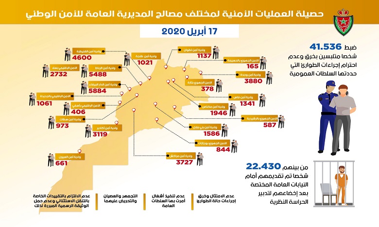 أعلنت المديرية العامة للأمن الوطني أن العمليات الأمنية المنجزة لفرض حالة الطوارئ لمنع تفشي وباء كورونا المستجد (كوفيد-19)، أسفرت خلال الأربع والعشرين ساعة الماضية عن توقيف 2.122 شخصا، تم إيداع 1.246 شخصا منهم تحت تدبير الحراسة النظرية رهن إشارة الأبحاث التمهيدية التي أمرت بها النيابات العامة المختصة، بينما تم إخضاع باقي المضبوطين لإجراءات البحث والتنقيط والتحقق من الهوية.