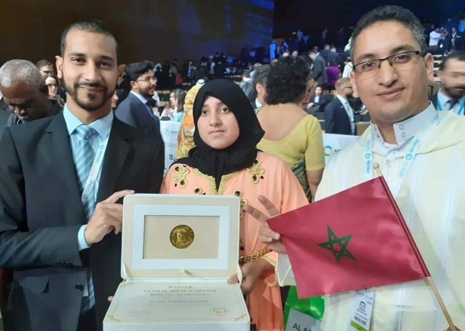 وتسلمت فاطمة الزهراء حمادي تلميذة بالسنة الثالثة إعدادي وأستاذين لمادة علوم الحياة والأرض من النادي البيئي لثانوية الأمل الإعدادية، الجائزة خلال حفل نظم بمناسبة افتتاح "أسبوع أبو ظبي للاستدامة، تقديرا لأهمية المشروع بعد أن حظي مشروعهم بالفوز من لدن لجنة التحكيم، المتعلق بجمع المياه المستعملة وتخزينها في المطفيات وتصفيتها بالاعتماد على الطاقة المتجددة لاستعمالها في سقي النباتات العطرية وتقطيرها وتصفية مياه الشرب.