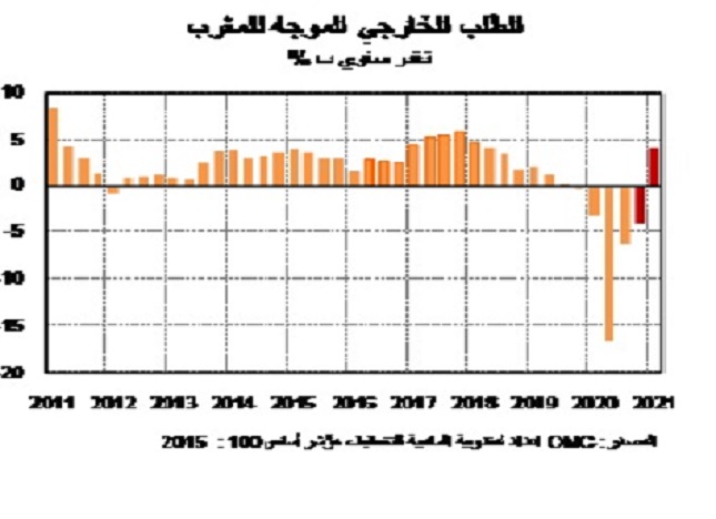 توقعت المندوبية السامية للتخطيط أن يشهد الاقتصاد الوطني ارتفاعا يناهز 0,5 في المائة، خلال الفصل الأول من 2021، وذلك بعد أربعة فصول من الانخفاض على التوالي. ويرجح أن يشهد النمو الاقتصادي بعض التسارع في وتيرته خلال الفصول المقبلة، مستفيدا من تأثير تقويم أثر الأساس المتعلق بانكماش النشاط الاقتصادي خلال فترة الحجر.
