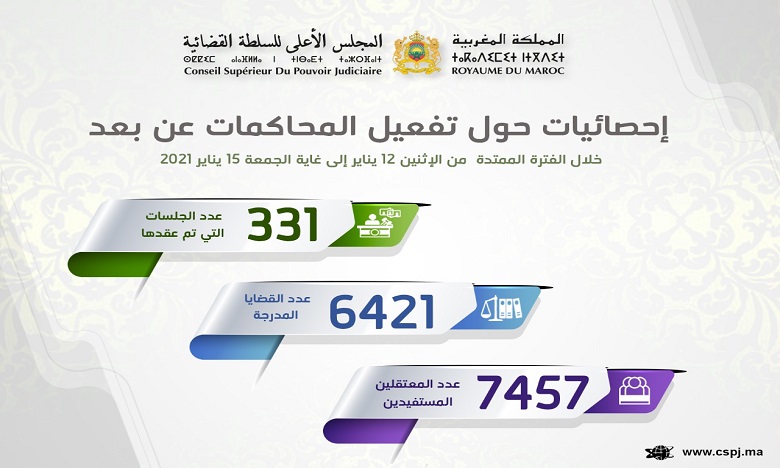 أعلن المجلس الأعلى للسلطة القضائية أن مختلف محاكم المملكة عقدت، 331 جلسة أدرجت خلالها 6421 قضية، وذلك في أربعة أيام، أي خلال الفترة الممتدة من 12 إلى 15 يناير الجاري.