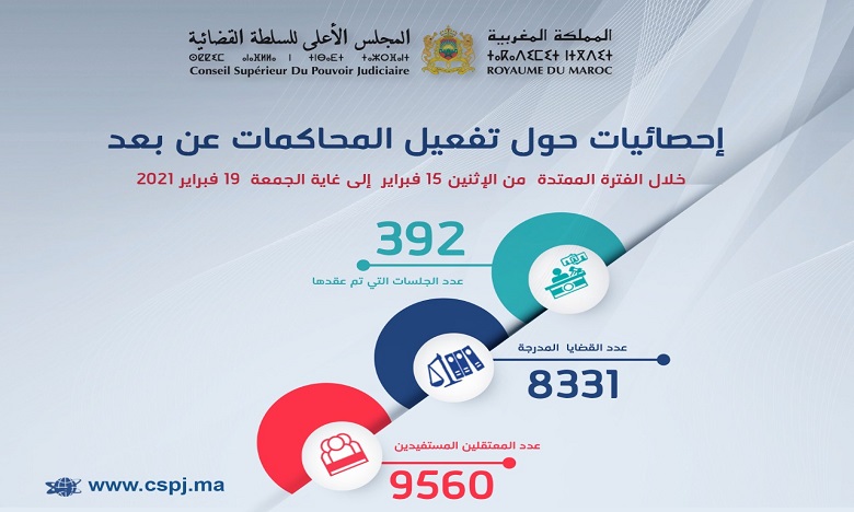 ووصف المجلس الأعلى، في بلاغه، حصيلة تفعيل المحاكمات عن بعد المسجلة خلال الفترة الممتدة من الاثنين 15 فبراير إلى الجمعة 19 فبراير 2021، بكونها كانت حصيلة متميزة بالنظر إلى الأرقام المسجلة.