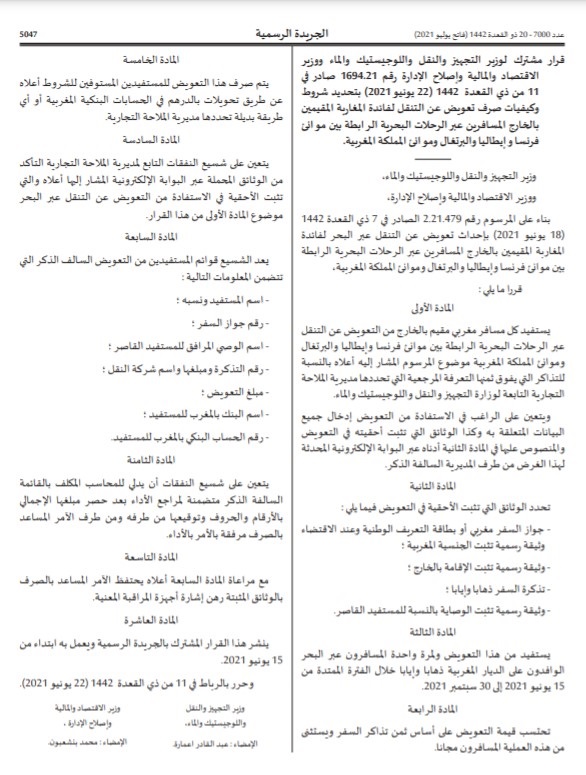 وحسب القرار فإنه يستفيد كل مسافر مغربي مقيم بالخارج من التعويض عن التنقل عبر الرحلات البحرية، والوافد على الديار المغربية ذهابا وإيابا، خلال الفترة الممتدة من 15 يونيو 2021 إلى 30 شتنبر 2021، لمرة واحدة.