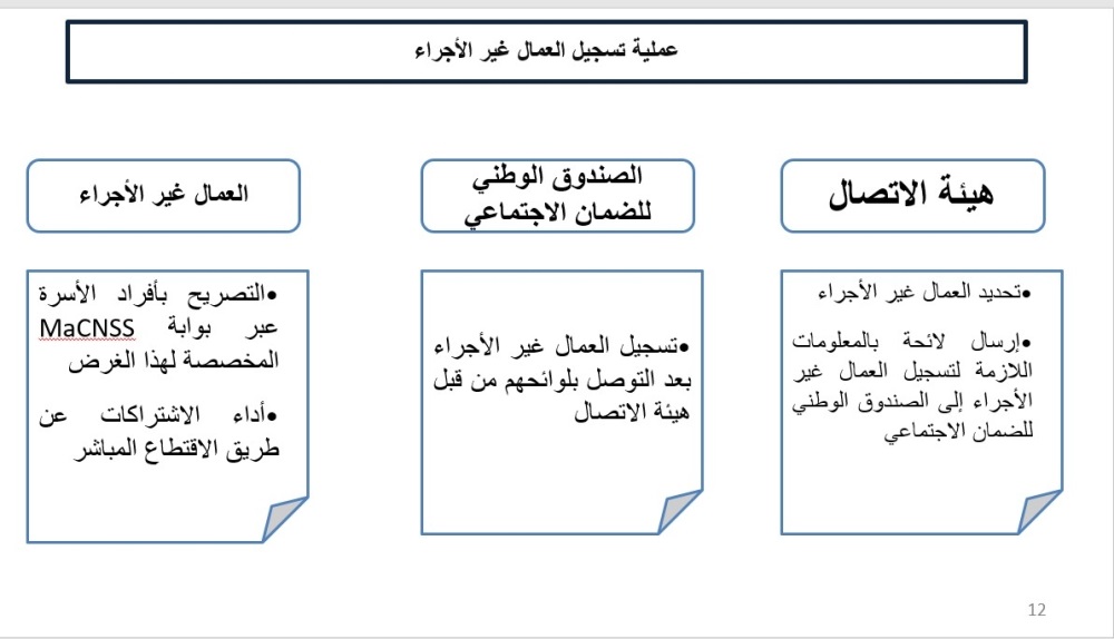 وفي المقابل يقوم الصندوق بالتحليل والتحقق من اللائحة المرسلة من طرف المديرية العامة للضرائب وبريد المغرب، وإرجاع اللائحة النهائية إليهما مع التفريق بين الأشخاص الخاضعين لنظام التأمين الإجباري عن المرض وغيرهم، ويعمد الصندوق كذلك إلى دعوة الأشخاص الخاضعين لنظام التأمين الإجباري عن المرض إلى تسجيل أنفسهم عن بعد. كما أن الخاضعين لنظام المساهمة المهنية الموحدة والمقاولين الذاتيين مطالبون في هذا السياق بالتصريح برقم المعاملات لدى المديرية العامة للضرائب وبريد المغرب، وأداء الاشتراكات، والتسجيل والتصريح بأفراد الأسرة من خلال بوابة MaCNSS، المخصصة لذلك.