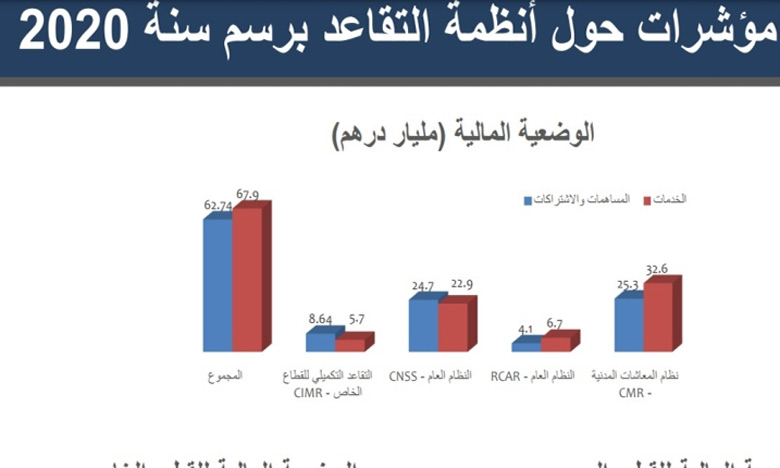 وبخصوص مؤشرات أنظمة التقاعد برسم 2020، أوردت الدراسة أن الخدمات بالنسبة للصندوق المغربي للتقاعد بلغت 32،6 مليار درهم، في حين سجلت الاشتراكات والمساهمات 25،3 مليار درهم، ووصلت الخدمات بالنسبة للصندوق الجماعي لمنح رواتب التقاعد 6.7 ملايير درهم وبلغت الاشتراكات والمساهمات 4.1 ملايير درهم، وشكلت الخدمات بالنسبة للصندوق الوطني للضمان الاجتماعي 22.9 مليار درهم، ومن جانب كشف التقاعد التكميلي للقطاع الخاص CIMR على أن الخدمات شكلت 5.7 ملايير درهم والاشتراكات والمساهمات 8.64 ملايير درهم، وبلغ مجموع الخدمات في الأنظمة الأربعة 67.9 مليار درهم، أما مجموع الاشتراكات فناهز 62.74 مليار درهم.