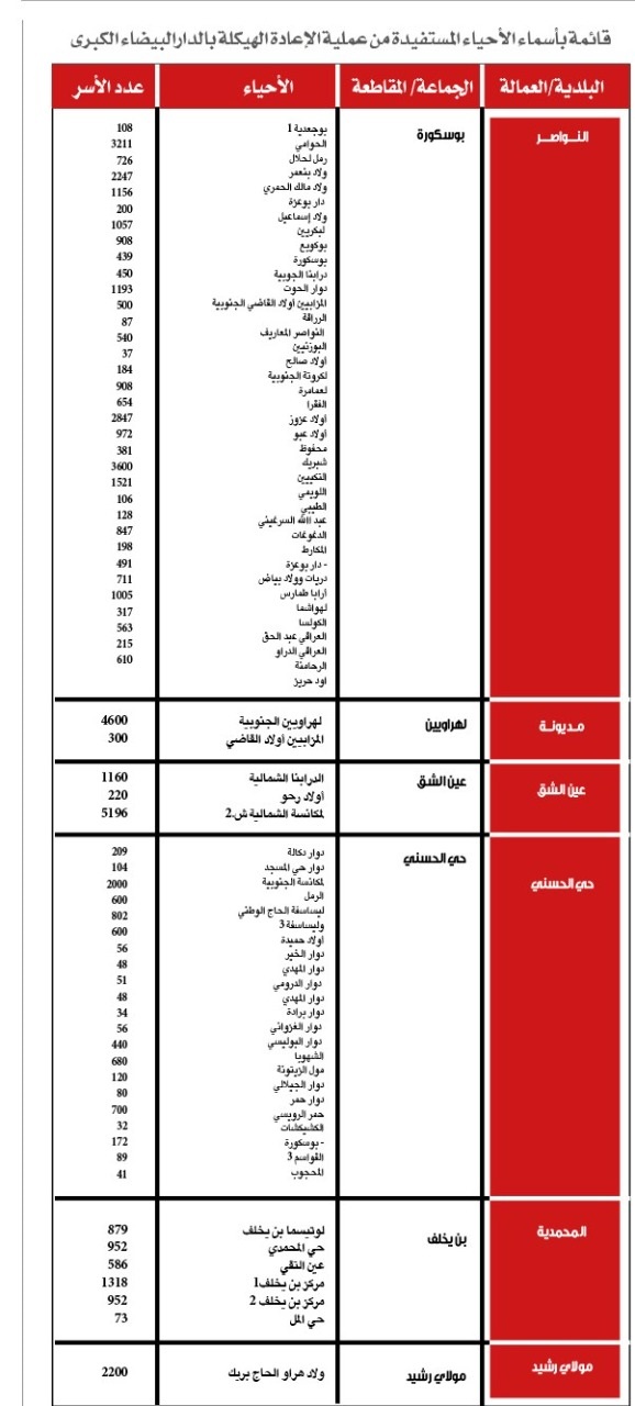 وتوجد أغلب هذه الأحياء في إقليم النواصر بنسبة تفوق 55 في المائة، بحوالي 40 حيا ودوار، تليه مقاطعة عين الشق الحي الحسني بـ22 حيا، وعمالة المحمدية (6)، ومديونة 3، وعمالة مقاطعات مولاي رشيد (حي واحد)، بينما يغيب عن قائمة المناطق المرشحة للاستفادة من إعادة الهيكلة، حي سيدي مومن القديم، بالدارالبيضاء، وهو أحد الأحياء الأكثر هشاشة ويعيش معظم سكانه في دور الصفيح أو منازل عشوائية، رغم مكانته استراتيجية، القريبة من الطريق السيار الحي الصناعي بعين السبع.