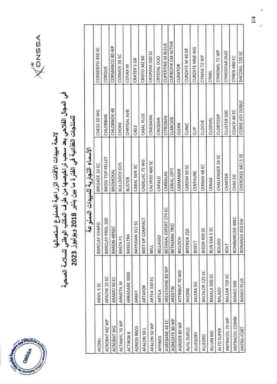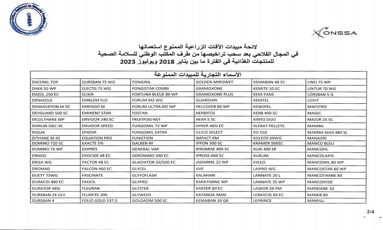 وفي هذا الصدد، وجه المدير العام المكتب الوطني للسلامة الصحية للمنتجات الغذائية، إلى المدراء المسؤولين بمختلف المصالح التابعة لـ "أونسا" لائحة خاصة بمبيدات الآفات الزراعية الممنوعة الاستعمال في المجال الفلاحي بالمغرب.