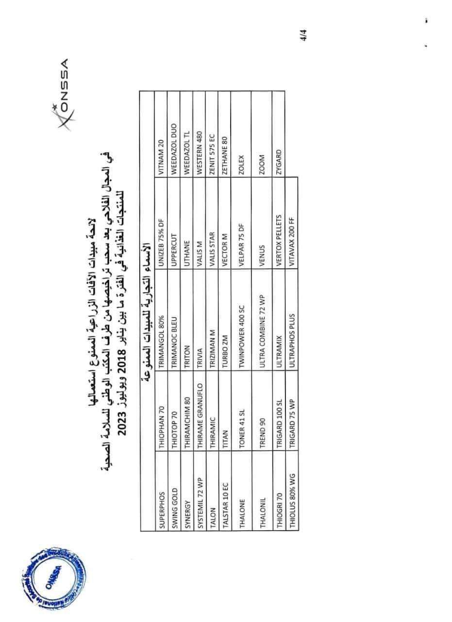 يشار إلى أن أونسا قام ما بين سنتي 2018 و2020 بسحب ترخيص 15 مادة فعالة من السوق الوطنية، منها كلوربيريفوس إيثيل، وكلوربيريفوس ميثيل، ودينوكاب، وأميتروول، وتريكلورفون، وكاربوفيوران، وبروبارجيت، وديكلوروفوس (DDVP)، وميثيداثيون، وإيبروديون، وديفوبلوفيدوسزين، لينورون، بروبينيب وبعض المستحضرات المحتوية على الغليفوسات، مشيرا إلى أن هذه العملية تدخل في إطار المقاربة المندمجة التي تهدف إلى الاستخدام المعلقن لمبيدات الآفات الزراعية للمساهمة في تنمية الزراعة المستدامة.