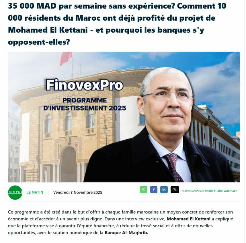 ويعرض هذا المحتوى منصة استثمار وهمية تدعى "FinovexPro" أو "PrimeAura"، ويربطها بشخصيات عمومية، مثل محمد الكتاني، الرئيس المدير العام لمجموعة التجاري وفا بنك، وكذلك بمؤسسات عمومية مثل بنك المغرب ووزارة المالية.
