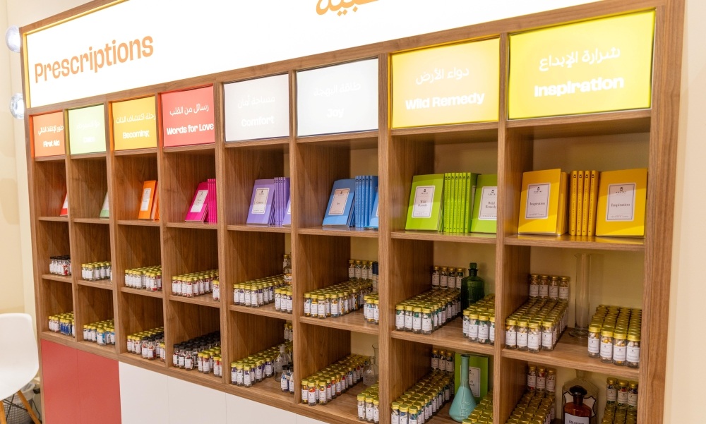 داخل "صيدلية الشعر"، تصطف العلب الطبية على رفوف صغيرة تحمل تسميات لافتة، من قبيل، "شرارة الإبداع"، و"دواء الأرض"، و"طاقة البهجة"، و"مساحة الأمان"، و"رسائل من القلب"، و"رحلة اكتشاف الذات".