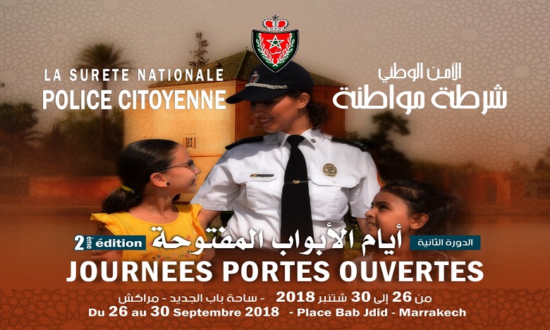 تنظم المديرية العامة للأمن الوطني، الدورة الثانية لأيام الأبواب المفتوحة تحت شعار "الأمن الوطني...شرطة مواطنة"، وذلك خلال الفترة الممتدة من 26 إلى 30 شتنبر الجاري بساحة باب الجديد بمدينة مراكش.