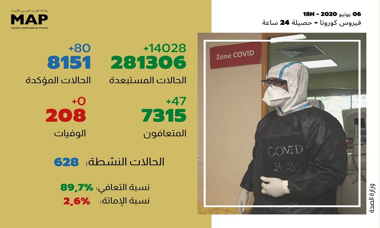 وكشف لمرابط عن تسجيل 80 حالة إصابة مؤكدة جديدة بفيروس كورونا المستجد (كوفيد-19)، إلى حدود الساعة السادسة من مساء اليوم السبت (24 ساعة الأخيرة)، لترتفع الحصيلة الإجمالية للإصابات بالمملكة إلى 8151 حالة، أي بمعدل 22,4 لكل مئة ألف نسمة.